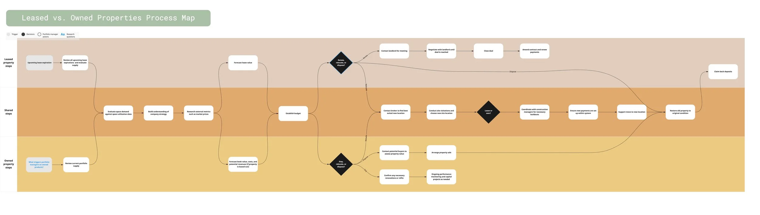 During my readouts of the customer journey map, the team provided feedback that they didn’t fully understand the portfolio manager’s process of evaluating a leased property versus an owned property. To help them distinguish these processes, I created an additional process map outlining the different steps of the leased and owned processes, as well as the places where they converge.
